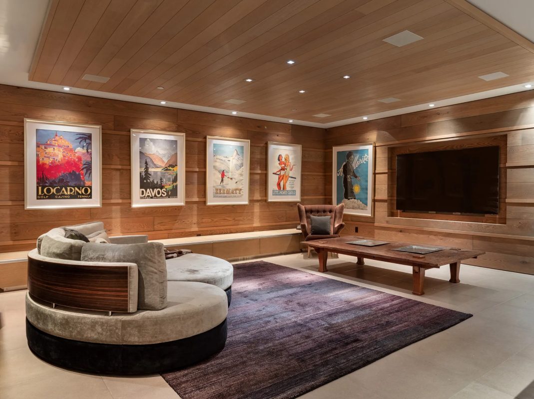 For entertaining guests, the mansion comes with a gold leaf-surrounded contemporary fireplace, and a ski lodge-inspired family room. Likewise, the grand patio by the pool and hot tub is a great place to gather, positioned to see the mountain and lake. Moreover, there’s a wine cellar, as well as a cinema.