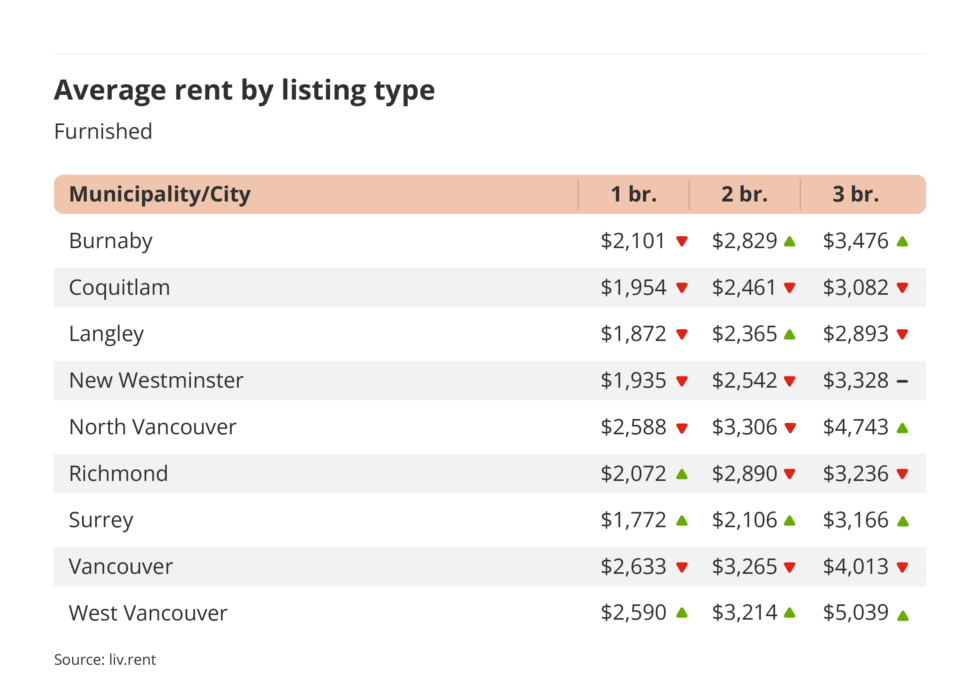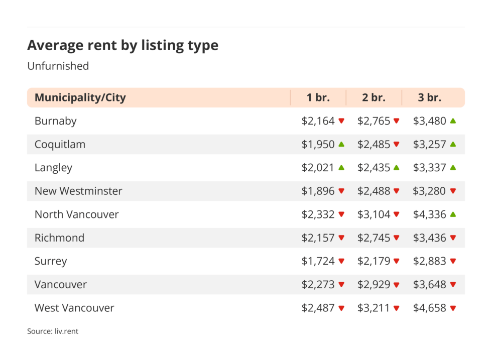 liv.rent reports that a number of cities have seen notable changes in average rent prices in January. Places like New Westminster (-8.63%), Coquitlam (-3.66%), and Vancouver (-3.13%) saw the biggest decreases. On the other hand, West Vancouver (4.36%), Richmond (2.58%) saw increases.