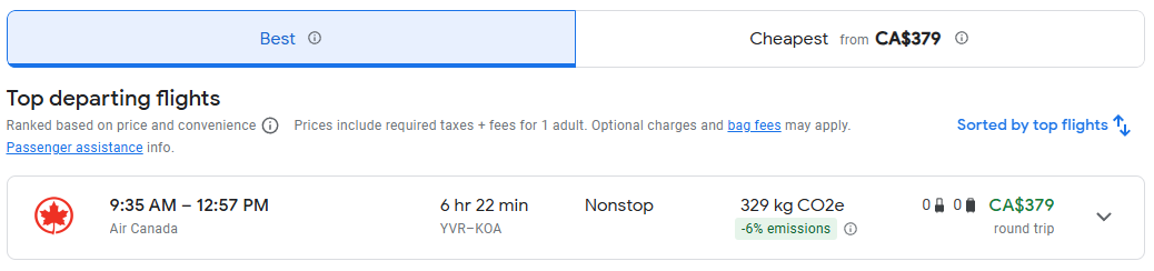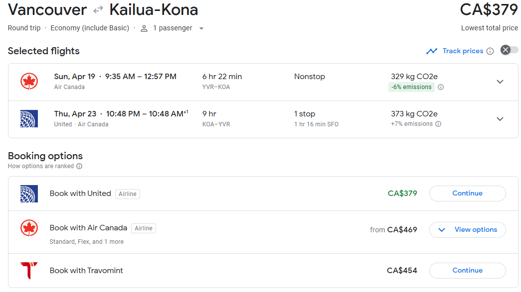 To get your plane tickets for just $379, you’ll be flying to Kailua-Kona with Air Canada and returning to Vancouver with United. As for booking, you’ll be going through United; you can also book with Air Canada, but their prices start at $469. Travomint is similarly offering bookings at $454, just slightly below Air Canada’s pricing.