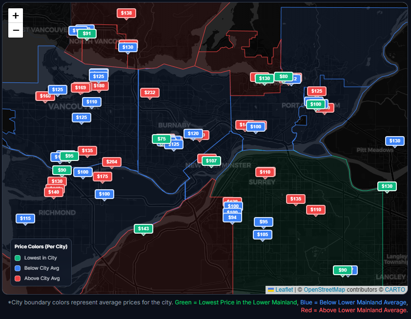On the other hand, the cheapest city is Surrey at $107. Other places like New Westminster, Port Coquitlam, and Coquitlam are also below the average of $128. Although, it should be noted that New Westminster’s prices are based on less than 3 shops.