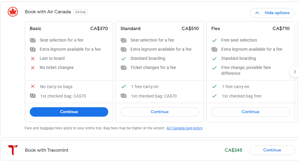 To get your plane tickets for only $345, you have to fly with Air Canada and book through Travomint. If you prefer to book directly through Air Canada, their ticket options are available for $370 at the lowest. But whatever way you book, the flights will both be nonstop and take between 6 to 6.5 hours.