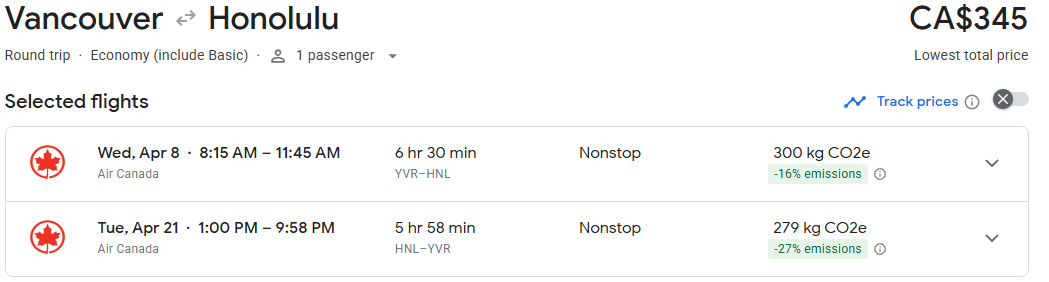 The deals we found were specifically for direct, roundtrip tickets during early to mid-April. Google Flights notes that prices are currently low for this search, with the least expensive flights for similar trips to Honolulu costing between $430 to $710. “Prices during this time are CA$59 cheaper on average.”
