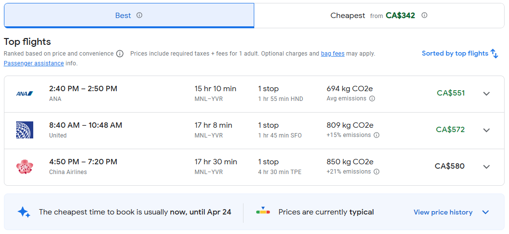 Now that your vacation is coming to a close, you need a way to get back. This final flight will get you from Manila to Vancouver during late September, and for a whole $249 cheaper than usual, according to Google Flights’ statistics.
