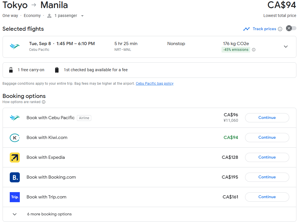 For just $94, you can fly directly and nonstop from Tokyo to Manila during mid September. You’ll be flying with Cebu Pacific and booking via Kiwi.com. For $2 more, you can also book with Cebu Pacific themselves.