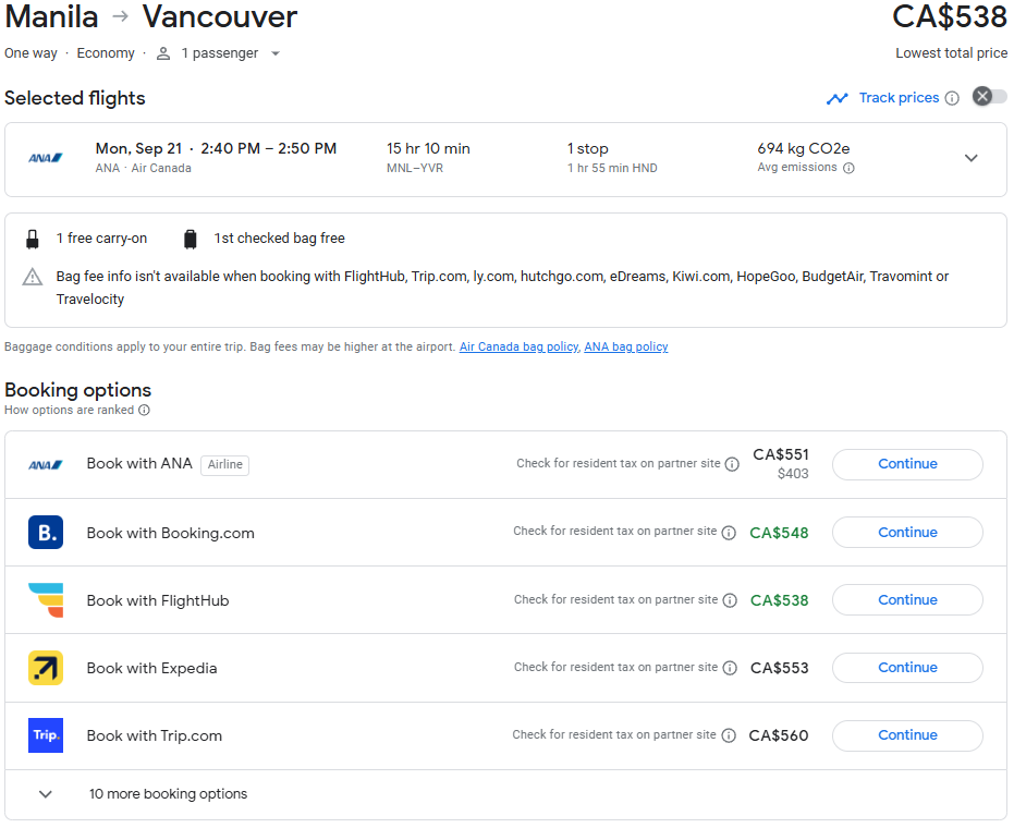 You can book directly through ANA for $551, or you can book with FlightHub for $538. Do note that bag fee info isn’t available via Google Flights when booking with FlightHub, Trip.com, ly.com, CheapOair, hutchgo.com, eDreams, Kiwi.com, HopeGoo, BudgetAir, Travomint or Travelocity.