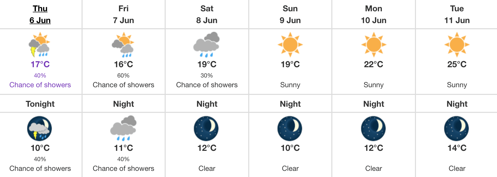 Thursday calls for a 40% chance of showers and a daytime high of 17°C. Likewise, there’s also a risk of a thunderstorm this afternoon.